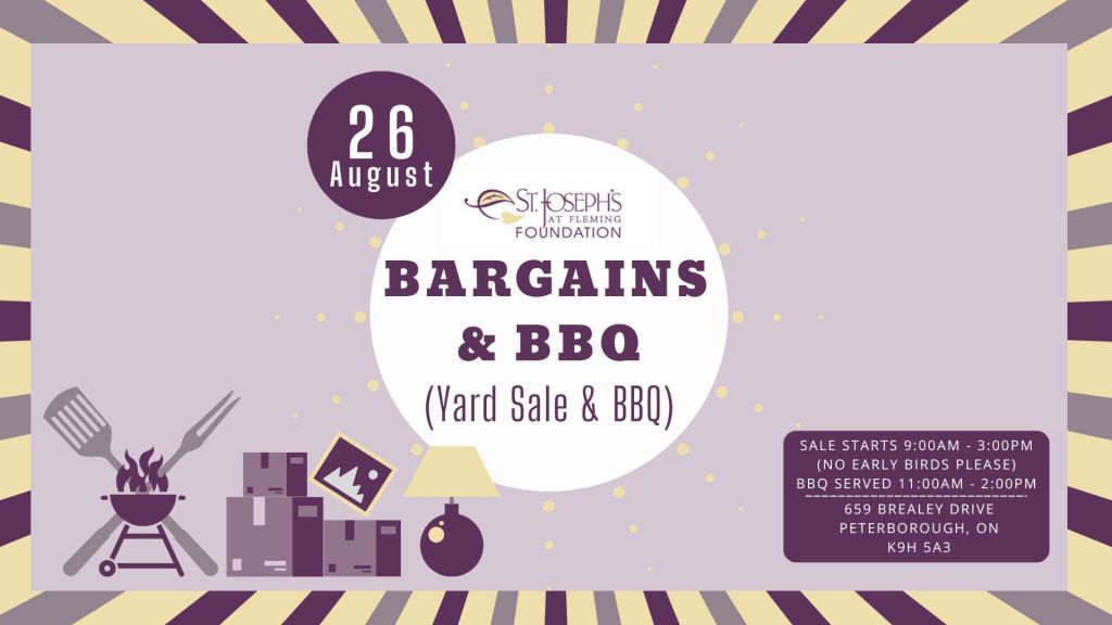 The St. Joseph’s at Fleming Foundation’s FIRST EVER fundraiser “BARGAINS &BBQ” yard sale and lunch is coming up on Saturday, August 26th. This will take place out on the terrace at St. Joseph’s at Fleming (659 Brealey Drive). You won’t want to miss out on this HUGE yard sale with AMAZING DEALS!