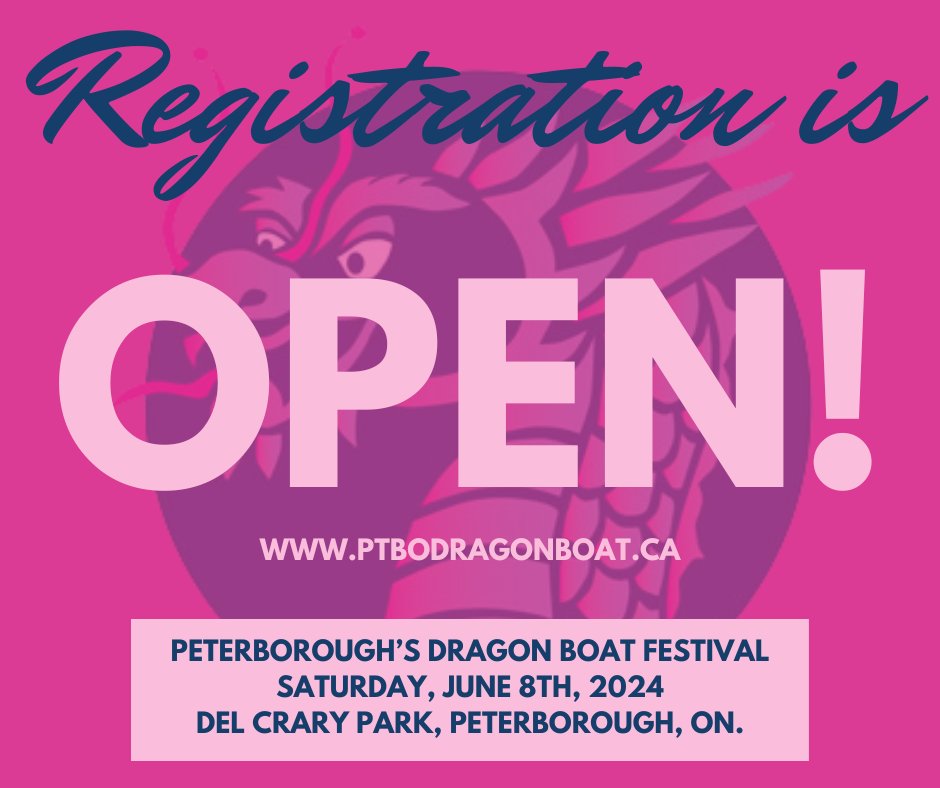 Registration for the 23rd edition of Peterborough’s Dragon Boat Festival opened February 25th at 12:01 AM and can be done at www.ptbodragonboat.ca. The first 3 teams to register will win a free extra practice in a dragon boat on Little Lake.