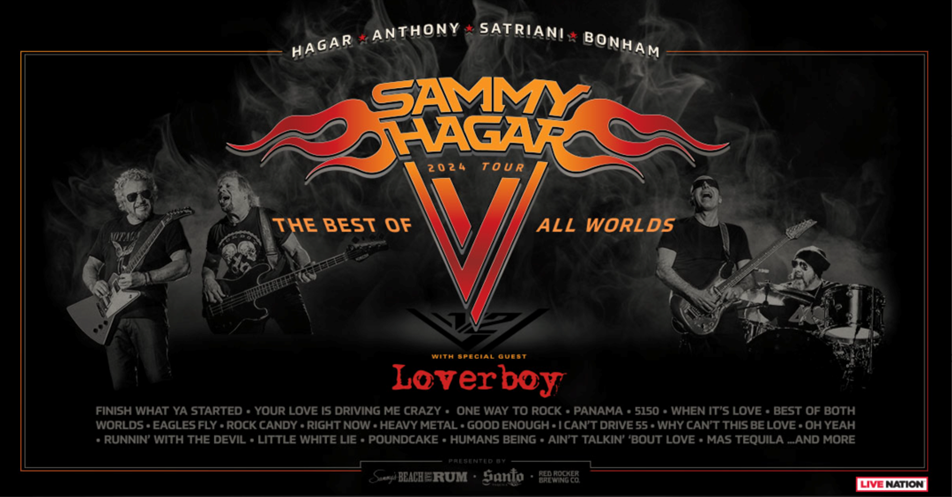 Rock & Roll Hall of Famer SAMMY HAGAR announced the long-awaited “THE BEST OF ALL WORLD’S” 2024 tour. Hagar will be joined by rock heavyweights and longtime bandmates MICHAEL ANTHONY (bass, backing vocals), JASON BONHAM (drums) and revealed exclusively on SiriusXM’s The Howard Stern Show this morning that JOE SATRIANI, one of the best guitar players in the world, will complete the band. Produced by Live Nation and featuring special guests Loverboy, the 28-date tour will commence on July 13 in West Palm Beach, FL and will conclude on August 31 in St. Louis, MO.