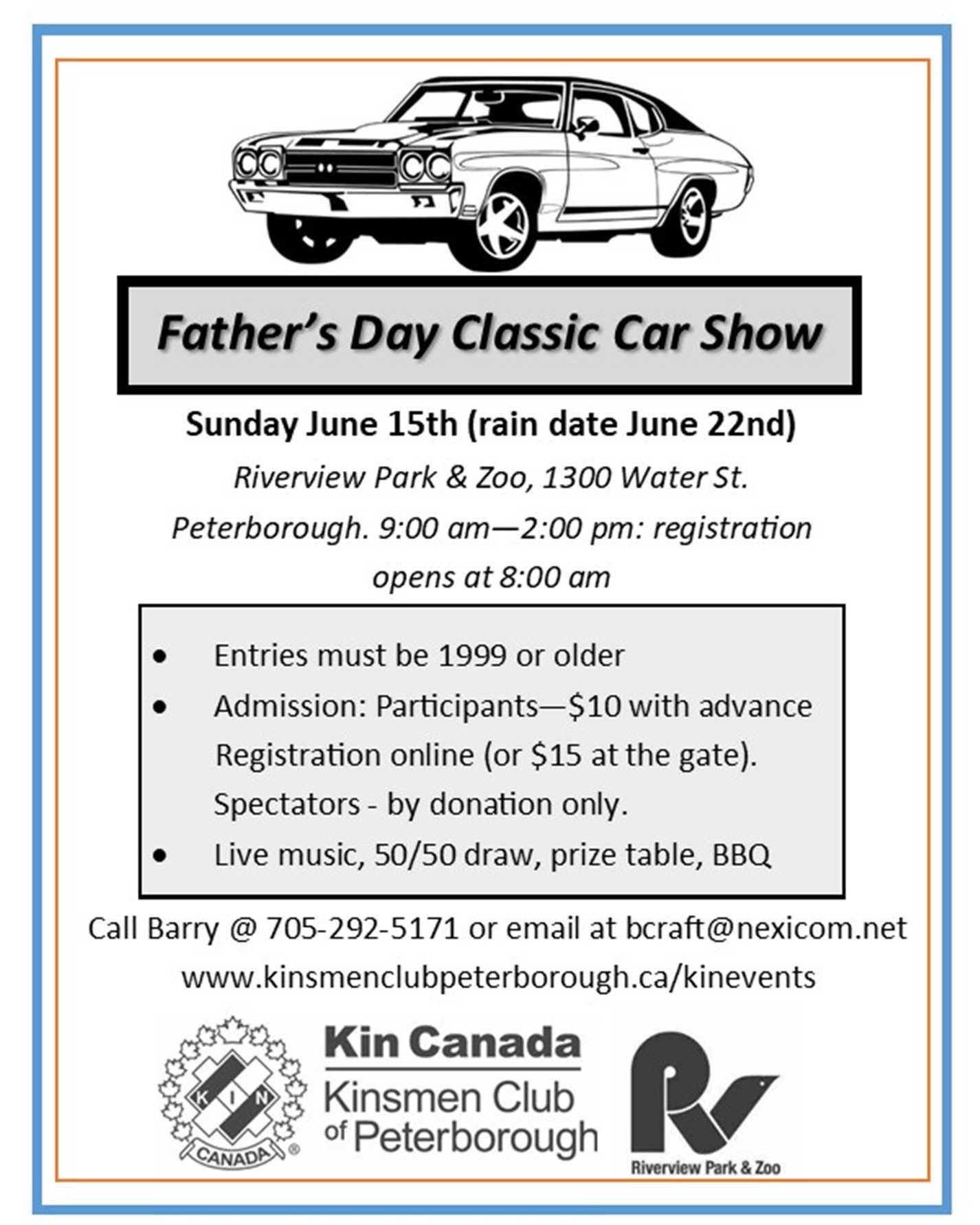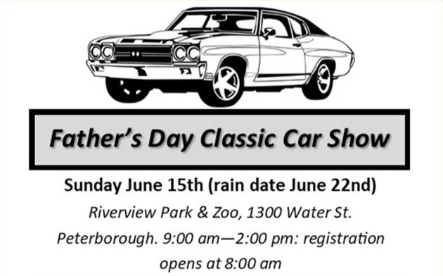 Father’s Day Classic Car Show Where Riverview Park and Zoo, 1300 Water Street, Peterborough, Ontario Map When Jun 15/25 09:00 AM - Jun 15/25 02:00 PM Age All Price Starting at $10 Website www.kinsmenclubpeterborough.ca/kinevents