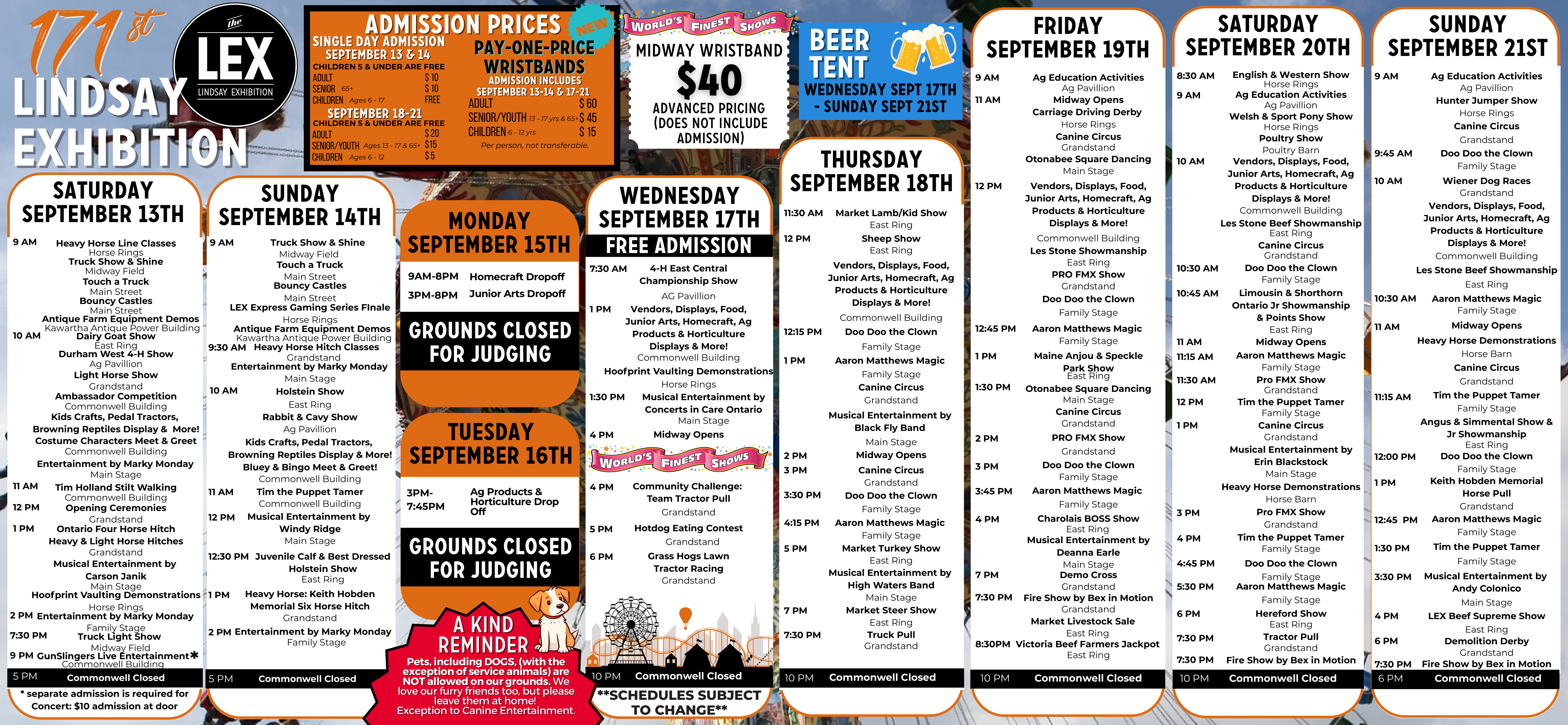 Lindsay Exhibition Where Lindsay Fairgrounds, 354 Angeline Street South, Lindsay , Ontario Map When Sep 13/25 09:00 AM - Sep 21/25 07:30 PM Age All Price Starting at $5 to $60 Website https://lindsayex.com/