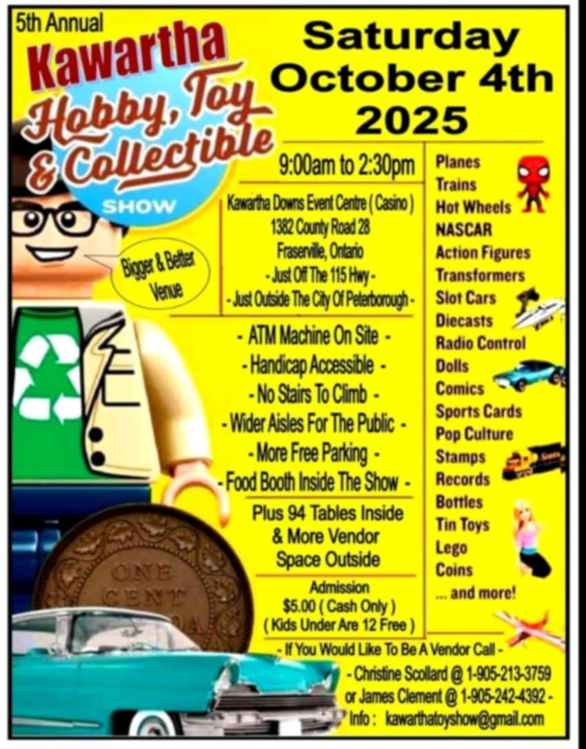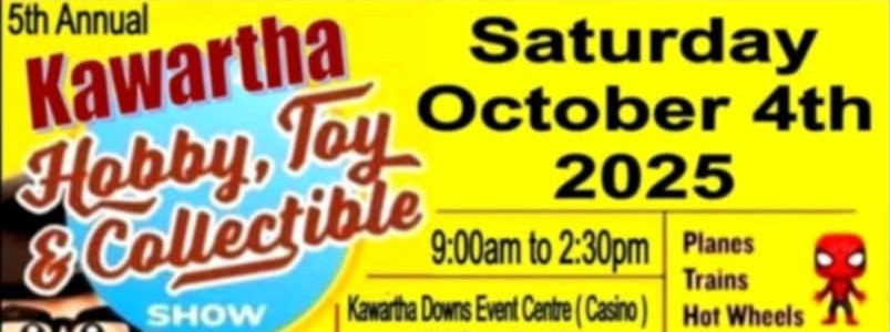 5th Annual Kawartha Hobby, Toy & Collectible Show Where Kawartha Down Event Centre, 1382 County Road 28, Fraserville, Ontario Map When Oct 04/25 09:00 AM - Oct 04/25 02:30 PM Age All Price Starting at $5.00 (kids under 12 free) Website https://www.facebook.com/profile.php?id=61552207851993